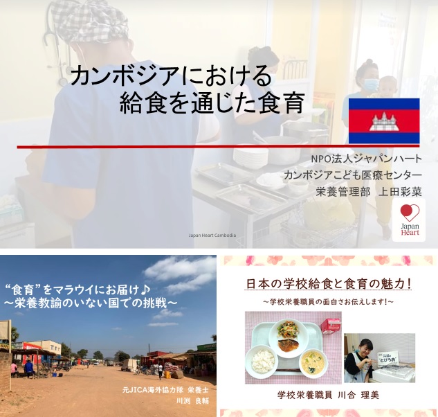 カンボジアの食育については、ジャパンハート栄養管理部が日々病院で取り組んでいる「給食」を教材とした食育について、カンボジア人スタッフとともに進めいてる栄養バランスの良い給食提供から、日本での食育を応用した取り組みについて話をしました。