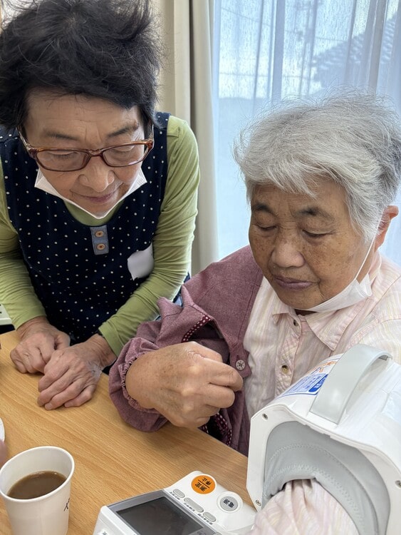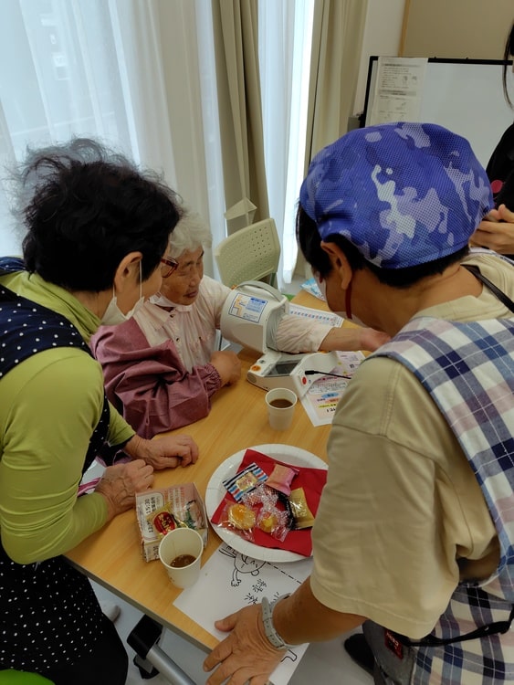 サロン活動では来場してくださる住民の皆さんの健康管理を目的に、血圧を測っていただいています。
