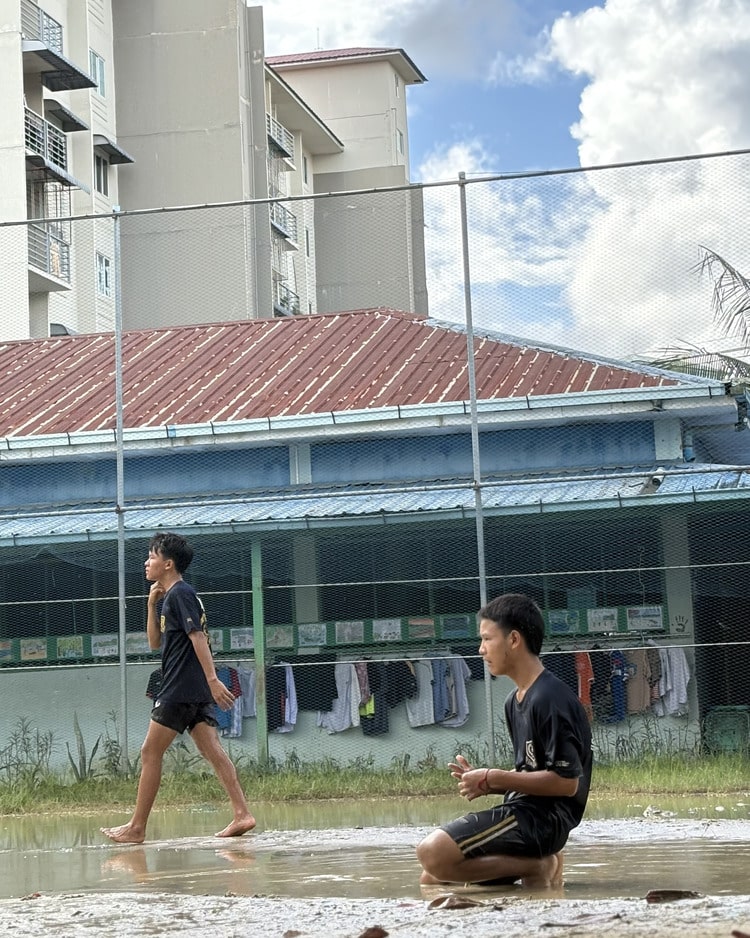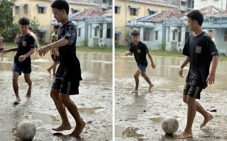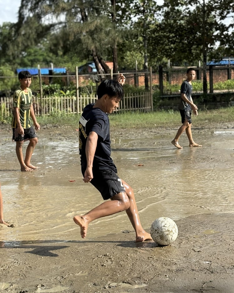 水たまりが点在するグラウンドはまるで大きな水上コートのようで、ボールを追いかけるたびに水しぶきが上がり、時には顔まで泥だらけになります。