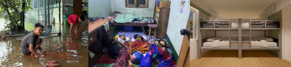 (左)雨季で冠水した施設で足場をつくる子どもたち(中)現施設内の様子(右)リニューアル後の生活棟イメージ